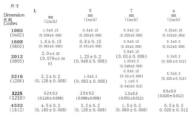 四、中高频铁氧体电感封装尺寸列表: