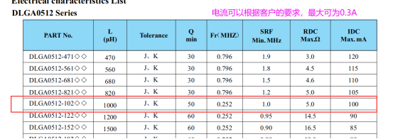 客户原先使用的是B82144A2105J色环电感,这款电感对应谷景的DLGA0512-102JTB,在参数上,TDK的电流只能做到0.2A,谷景的可以做到0.3A。