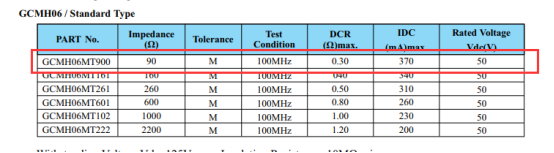 谷景对应GCMH06系列贴片共模电感的参数:90Ω的阻抗、370mA的额定电流、0.3Ω的直流电阻。
