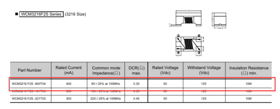 WCM3216系列贴片共模电感的参数:90Ω的阻抗、400mA的额定电流、0.3Ω的直流电阻。