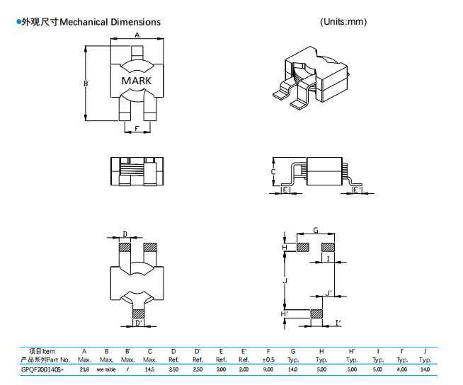 一、扁平线贴片电感GPQF200140产品特性:1、扁平线绕线结构,超低内阻2、超大电流承载能力,优异的热稳定性3、安装方式灵活,兼容PCB内嵌元件工艺 二、产品应?:1、?电流要求驱动电路滤波2、升压或降压电源电路转换器三、封装尺寸列表: